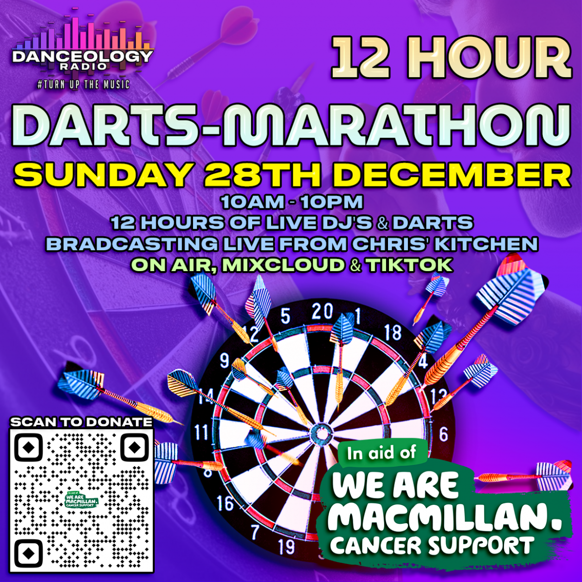 DANCEOLOGY RADIO PRESENTS: 12-HOUR DARTS MARATHON! Get ready for a full day of beats, banter, and bullseyes! Join us Sunday 28th December, 10AM–10PM for 12 hours of live DJs and darts—broadcasting straight from Chris' Kitchen to your ears and screens via Danceology Radio, Mixcloud, and TikTok. This event is in aid of Macmillan Cancer Support—scan the QR code or click the link to donate and make a difference. Music. Darts. […]